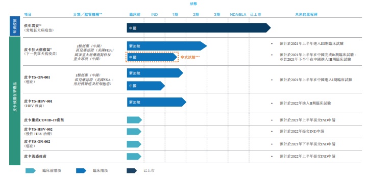 截至最后可行日期,依生生物拥有在中国或新加坡处于不同临床试验阶段的三个候选在研产品,包括皮卡狂犬病疫苗、皮卡YS-ON-001及皮卡YS-HBV-001;及四种针对COVID-19、HBV、流感及具有巨大医疗需求的癌症的临床前阶段候选在研产品。截至最后可行日期,公司已成功从27家省级疾控中心获得资格,以覆盖约1700家县级疾控中心。