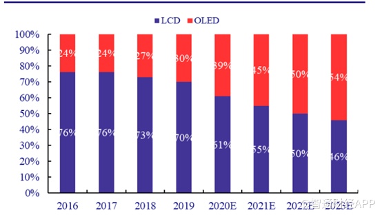 但是手机用LCD则不乐观,一方面是当前全球手机出货量基本饱和,过去几年几近零增长,另一方面手机也是技术替代的前沿区域。截至2019年,LCD手机渗透率为70%,但是2023年,LCD渗透率或将降为46%,OLED将超过LCD屏手机。