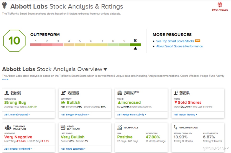 此外,在TipRanks的智能评分系统中,雅培获得了“满分10分”的评分,这表明该股有超越市场预期的强大潜力。