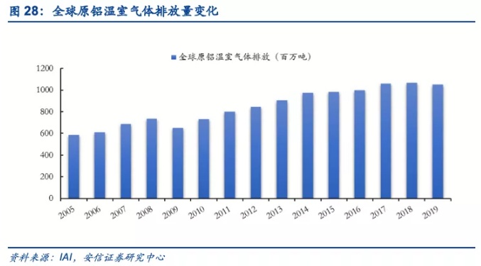 全球电解铝碳排放增速较快,电力排放是主要来源。据IAI数据显示,2019年,全球原铝生产量6433万吨,碳排放量10.52亿吨,比2018年略减少1700万吨。2005年,全球原铝碳排放总量5.55亿吨,2010年7.27亿吨,2015年9.62亿吨,15年间增长了89.6%,年均增幅4.7%。同期全球原铝产量从3200万吨增长到6433万吨,原铝行业碳排放总量增幅略低于产量增幅。