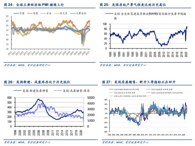 美国房地产周期持续孕育,有望带动铝需求释放。考虑到美国GDP占全球比例在24%左右,终端消费对基本金属需求增速的贡献度不容小觑。当前美国房地产市场受益于低利率和低库存,景气程度正在显著提升。美国成屋销售库存、新建住房待售面积已去化至过去20年以来的低位,美国新屋销售、成屋销售和建造支出同比正在加速,有望带动房地产投资、后周期消费等一系列需求。