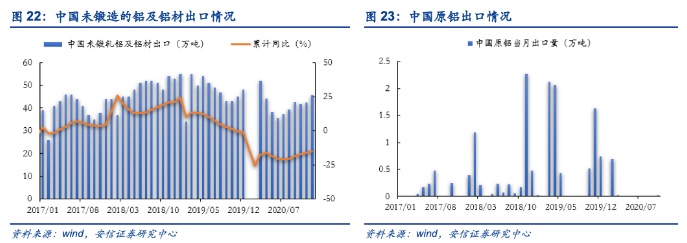 根据海关总署数据,12月未锻造的铝及铝材出口数量为45.61万吨,累计出口485.74万吨,累计同比下降15.2%,主要受海外疫情影响,但6月之后逐步提升显著,海外需求稳步恢复。原铝方面,10月出口数量为203.6万吨,累计出口7749.4吨,数量相对有限。