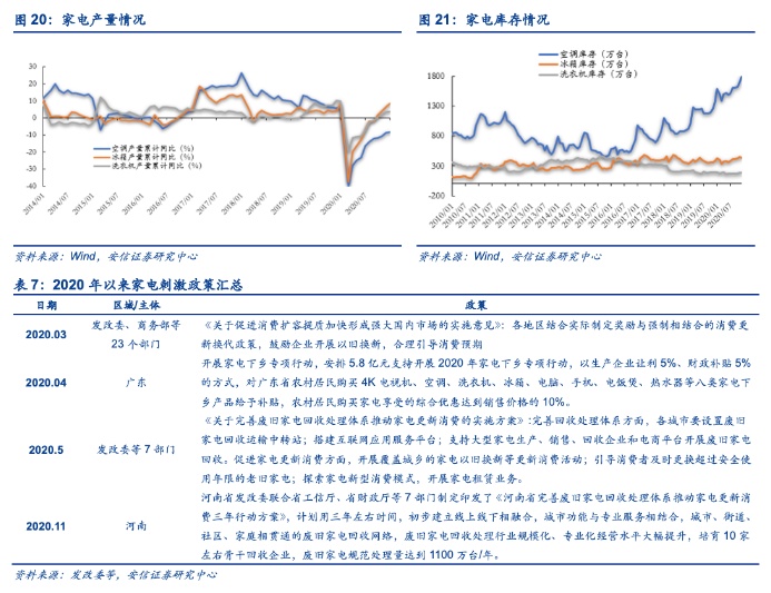冰箱洗衣机恢复迅速。产量方面,12月空调、冰箱和洗衣机产量分别为2152.5、796.4和806.4万台,累计产量同比分别为-8.3%、+8.4%和+3.9%,空调较上月降幅收窄0.5pct,冰箱和洗衣机年内继9月份首次转正后持续为正,涨幅2.1pct和0.3pct。库存方面,12月空调、冰箱和洗衣机库存分别为1929.7、438.8和185.6万台,空调库存依然位于历史高位。
