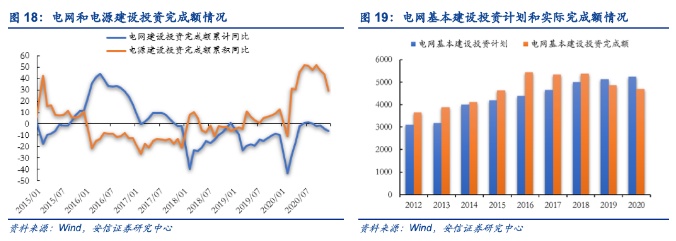 2020年国内电网投资下滑6.2%,但碳中和背景下未来能源革命对于电网的需求值得期待。2020年电网基本建设投资完成额累计同比下降6.2%。电源基本建设投资完成额累计同比上升29.2%。高压输电项目主要由国家规划审批,高度依赖政策,2020年国家电网在推动金上水电外送、陇东至山东、哈密至重庆这 3 条特高压纳入电力规划,有望在 2021 年获得核准实施。远期看,地方发改委拟推动纳入“十四五”电力规划的特高压线路 3 条:青海海西州外送、哈尔滨外送、吉林外送,短期数量较少,但考虑碳中和背景下对于新能源的需求,未来电网投资值得期待。