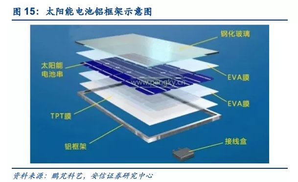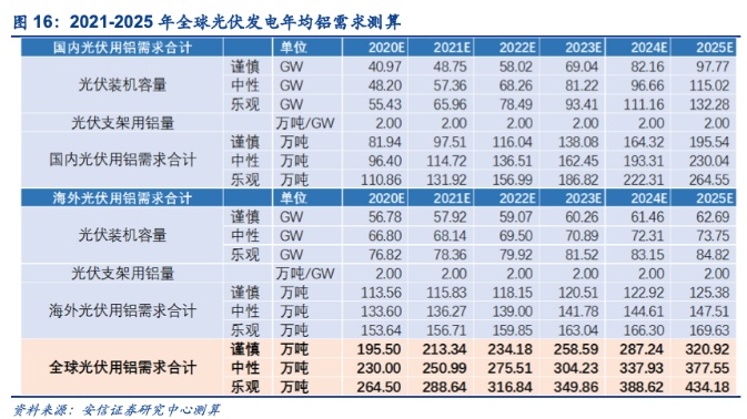 国内2020-2025年光伏产业年均铝需求量增速在19%。据我们中性测算条件下,国内2020-2025年光伏年均新增装机量在从48GW提升至115GW,按照光伏系统中支架的需求强度约为20kg/KW,2020-2025年年均铝需求量从96提升至230万吨,年均增速19%。