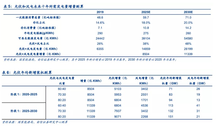 非化石能源占比持续提升。据安信电新测算,假设中国非化石能源占比在未来十年持续提升,于2025年和2030年分别提升至18%和20%,在平均发电煤耗逐年下降,光伏+风电发电量占比逐年提升的基础上,分别以2019年和2025年为基年,预计2025年和2030年所需光伏+风电发电量增量分别达0.85万亿KWh和1.13万亿KWh。