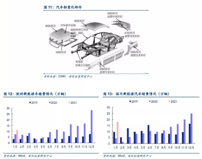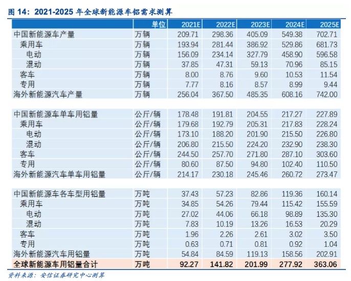 据我们测算2021-2025年我国新能源汽车产量分别为210、298、405、549、703万辆,CAGR高达40.6%,2021-2025年我国新能源车用铝量分别为37、57、83、119、160万吨,CAGR约49.7%。2021-2025年全球新能源汽车产量分别为465、666、890、1158、1445万辆,CAGR高达38.3%,2021-2025年全球新能源车用铝量分别为92、142、202、278、363万吨,CAGR约42.8%。