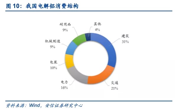 从终端消费结构来看,建筑、交通和电力占我国电解铝需求68%,其中建筑是占比最大达31%,需求主要集中在房地产。房地产竣工周期可能是拉动铝终端消费需求的最大动力。