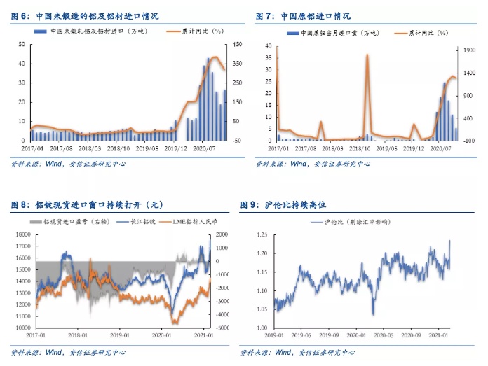 铝材和原铝进口均创下历史新高,显示国内需求强劲。根据海关总署数据,12月未锻造的铝及铝材进口数量为26.56万吨,同比增长147.27%;2020年累计进口270.39万吨,同比上升318.7%,显示2020年国内整体需求强劲,预计这种延续性也将持续到2021年。原铝方面,由于电解铝进口需缴纳13%的增值税,原铝进口在中国电解铝供应中占比相对较小,但今年以来由于铝价内强外弱,12月进口数量为13.02万吨,1-12月累计进口106.25吨,创下历史新高。