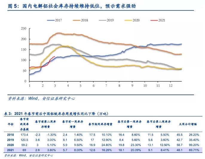 社会库存累库同比下降,下游需求景气度延续。据SMM最新库存数据,截至3月4日,国内电解铝社会库存117.3万吨,较前一周增加9.1万吨,上涨8.41%,考虑到近几个月电解铝产量增速创下历史新高,在此背景下的累库增速并未明显上行,显示目前的需求强劲。此外,据Mymetal统计,2021年1月全国电解铝企业加权平均铝水比例为64%,去年同期为61%,较去年同期高3个百分点,一定程度表明下游需求景气度延续。