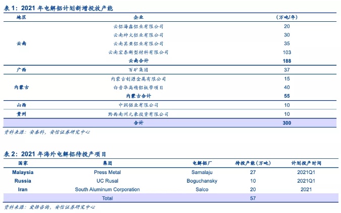 国内2021年计划投产产能约300万吨。据安泰科统计,国内2021年计划投产产能约300万吨,考虑魏桥为在产置换产能,实际2021年国内具备投产条件的新增产能规模200万吨,主要集中在内蒙古、云南、广西等相对低成本区域。但受制于配套建设进度、资金,投产进度较为缓慢,预计全年净贡献产量约100-150万吨。