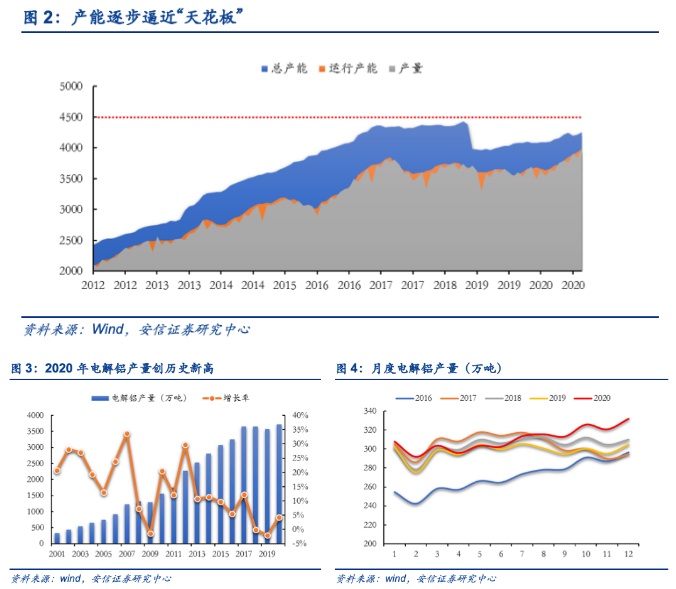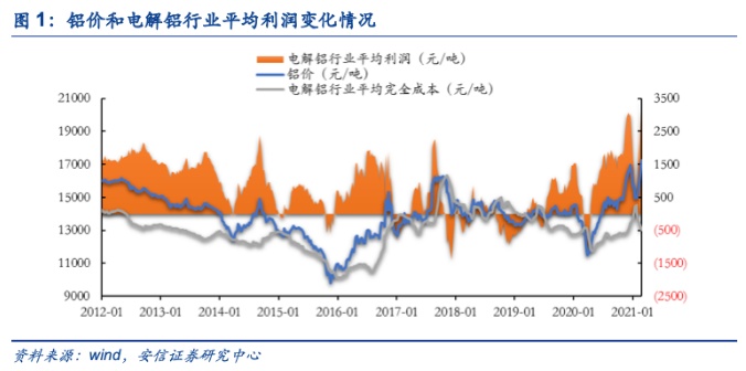 2020年我国电解铝产量和吨铝利润均创出历史新高,供给侧改革红利不断释放。2020年是我国电解铝行业创下历史的一年,一方面随着产能置换的不断推进,电解铝产量创历史新高,2020年全年产量达到3724万吨,同比增长4.2%;另一方面,受益于2017年电解铝供给侧改革红利,与疫情过后下游需求复苏超预期,电解铝行业利润创下历史新高,未来有望持续维持在高位。