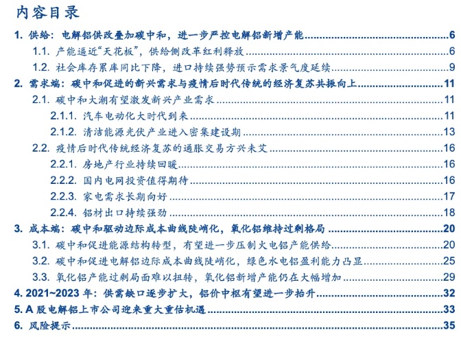风险提示:1)电解铝产能增量投放超预期;2)传统行业和新兴新能源车和光伏用铝需求低于预期;3)碳中和政策目标贯彻力度低于预期。