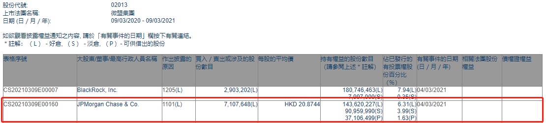 智通财经APP获悉,香港联交所最新资料显示,3月4日,摩根大通增持微盟集团(02013)约710.76万股,每股作价20.8744港元,总金额约为1.48亿港元。增持后最新持股数目约为1.44亿股,最新持股比例为6.31%。