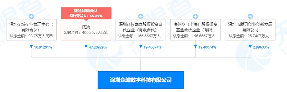 深圳企域数字科技有限公司成立于2020年3月,法定代表人为沈扬,经营范围包括行业管理和信息化解决方案开发与应用;高可信计算、智能网络、移动互联网、物联网等技术与应用基于网络的软件服务平台、软件开发和测试服务、信息系统集成、咨询服务等。股权穿透图显示,沈扬为该公司最大股东及疑似实际控制人。