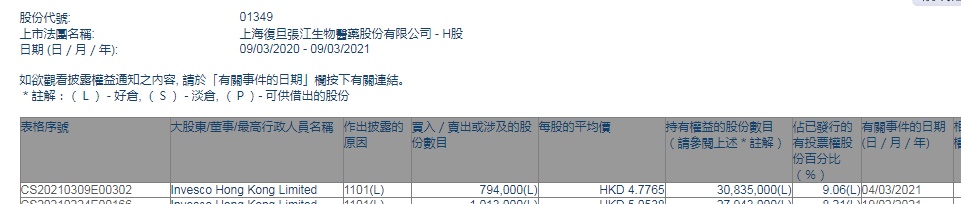 智通财经APP获悉,香港联交所最新资料显示,3月4日,Invesco Hong Kong Limited增持复旦张江(01349)79.4万股,每股作价4.7765港元,总金额约为379.3万港元。增持后最新持股数目为3083.5万股,最新持股比例为9.06%。