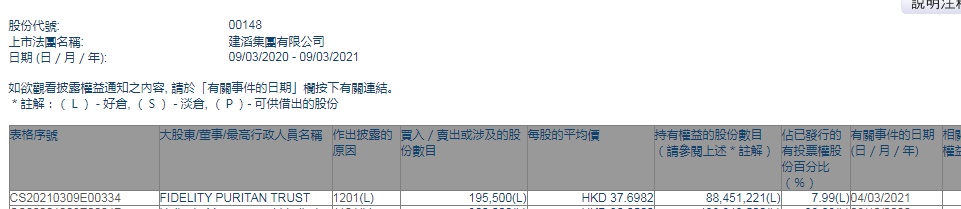 智通财经APP获悉,香港联交所最新资料显示,3月4日,FIDELITY PURITAN TRUST减持建滔集团(00148)19.55万股,每股作价37.6982港元,总金额约为737万港元。减持后最新持股数目约为8845.1万股,最新持股比例为7.99%。