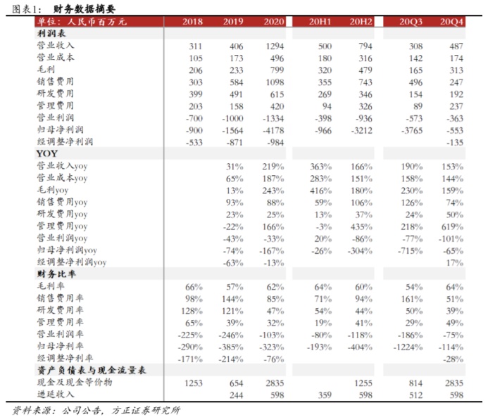 (2)销售、研发、管理费用:20Q4销售费用2.5亿元,YOY+74%,增速远低于收入增速(153%)。20Q4销售费用率51%(同比-23.1pct,环比-110.5pct)。2020全年销售费用11亿元,YOY+88%,销售费用率85%(同比-59pct)。