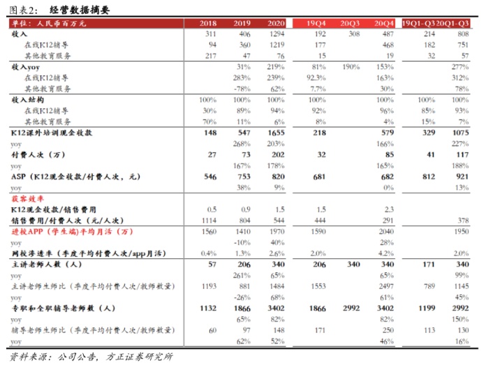 (1)收入:20Q4公司收入4.9亿元,YOY+153%。收入增长主要受K12业务驱动:Q4 在线K12课外培训业务收入4.7亿元,YOY+163%,占比96%,K12业务现金收款5.8亿元,YOY+166%,付费人次85万,YOY+165%。