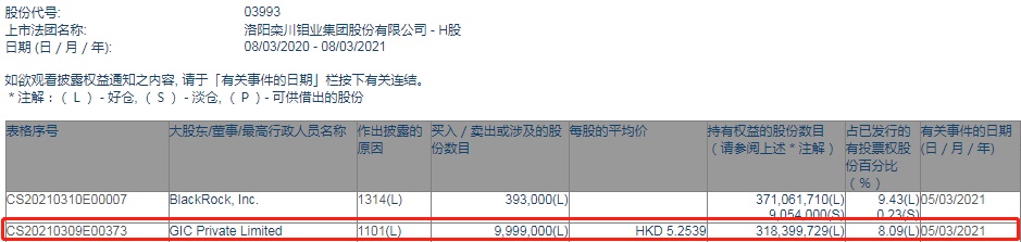 智通财经APP获悉,香港联交所最新资料显示,3月5日,新加坡政府投资公司GIC增持洛阳钼业(03993)999.9万股,每股作价5.2539港元,总金额约为5253.37万港元。增持后最新持股数目为3.18亿股,最新持股比例为8.09%。