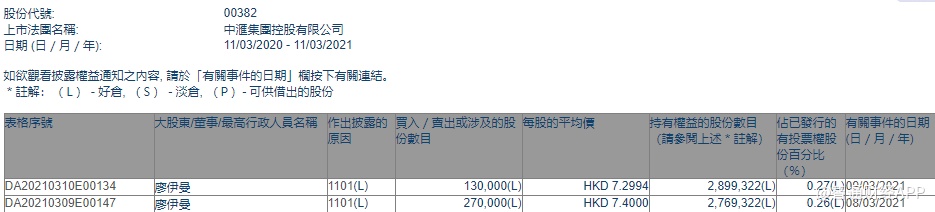 智通财经APP获悉,香港联交所最新资料显示,3月8日至9日,中汇集团(00382)执行董事兼CEO廖伊曼连续两日分别增持中汇集团27万股和13万股,每股作价分别为7.4和7.2994港元,总金额约为294.7万港元。增持后最新持股数目约为289.9万股,最新持股比例为0.27%。