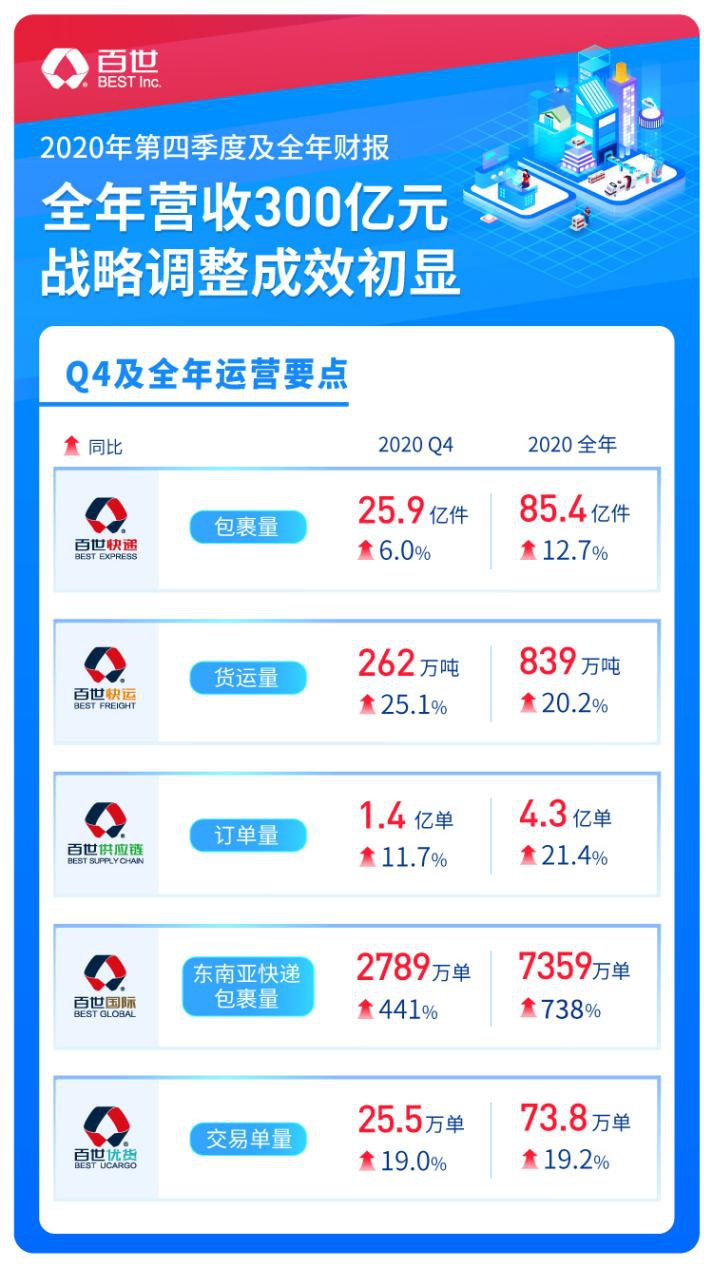 智通财经APP获悉,3月11日,中国领先的智慧供应链解决方案与物流服务提供商百世集团(BEST.US)发布了2020年第四季度以及2020年全年未经审计财务业绩。