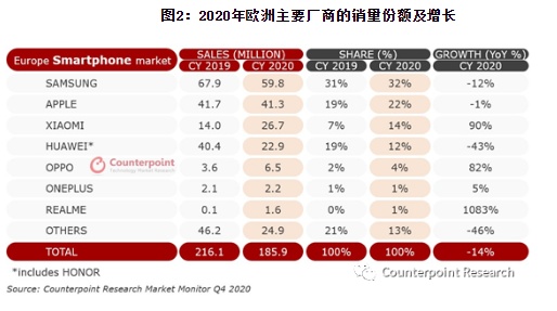 此外,华为几乎退出了欧洲市场。2020年,华为的市场份额从1月份的15%下跌到了12月份的5%,预计2021年这一趋势将持续。