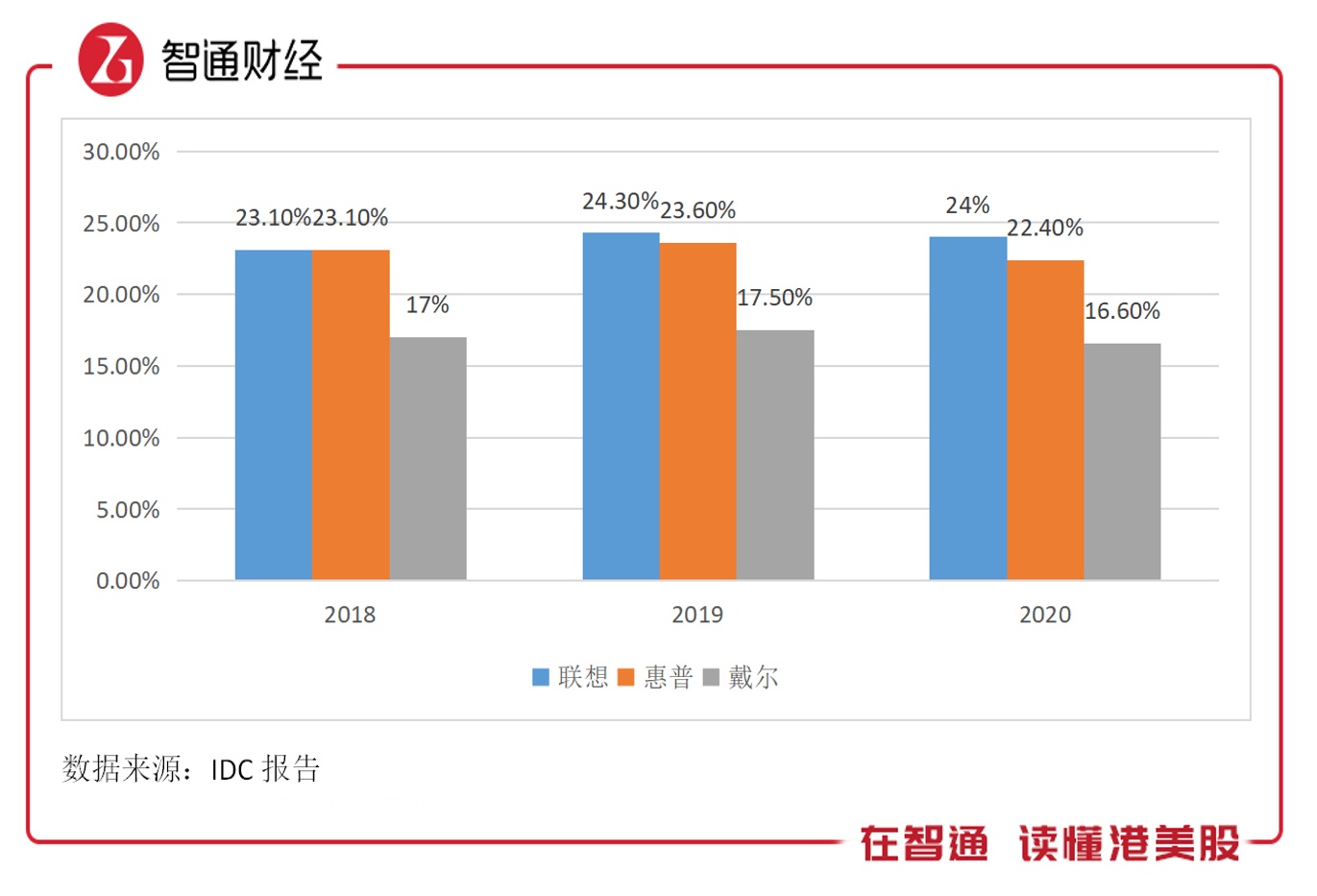 根据IDC报告,2020年联想出货量7266.9万台,市场份额24%,分别高于惠普及戴尔1.6个及7.4个百分点,连续三年市场份额第一,且增长速度也远高于同行,2020年出货量同比增长12%,分别高于惠普及戴尔4.5个及3.9个百分点。在2020年Q3及Q4,联想全球市场份额均超过25%。