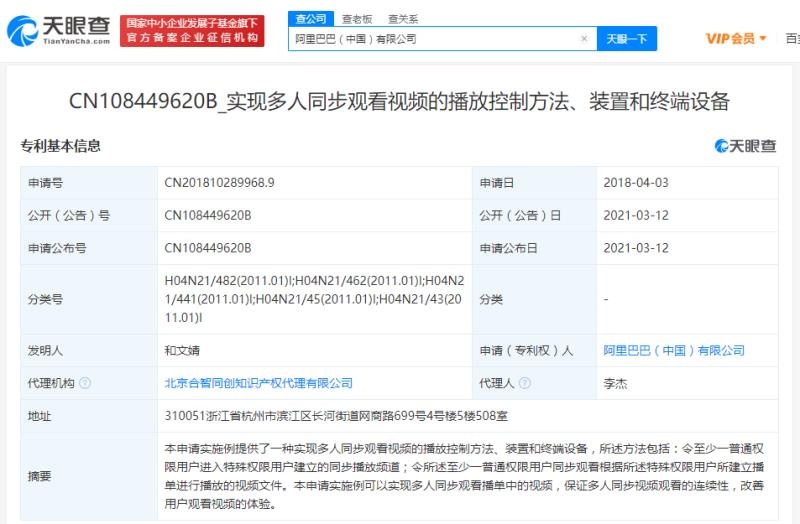 智通财经APP获悉,天眼查App显示,3月12日,阿里巴巴(中国)有限公司公开一项名为“实现多人同步观看视频的播放控制方法、装置和终端设备”发明专利,公开号CN108449620B,申请日期为2018年4月。