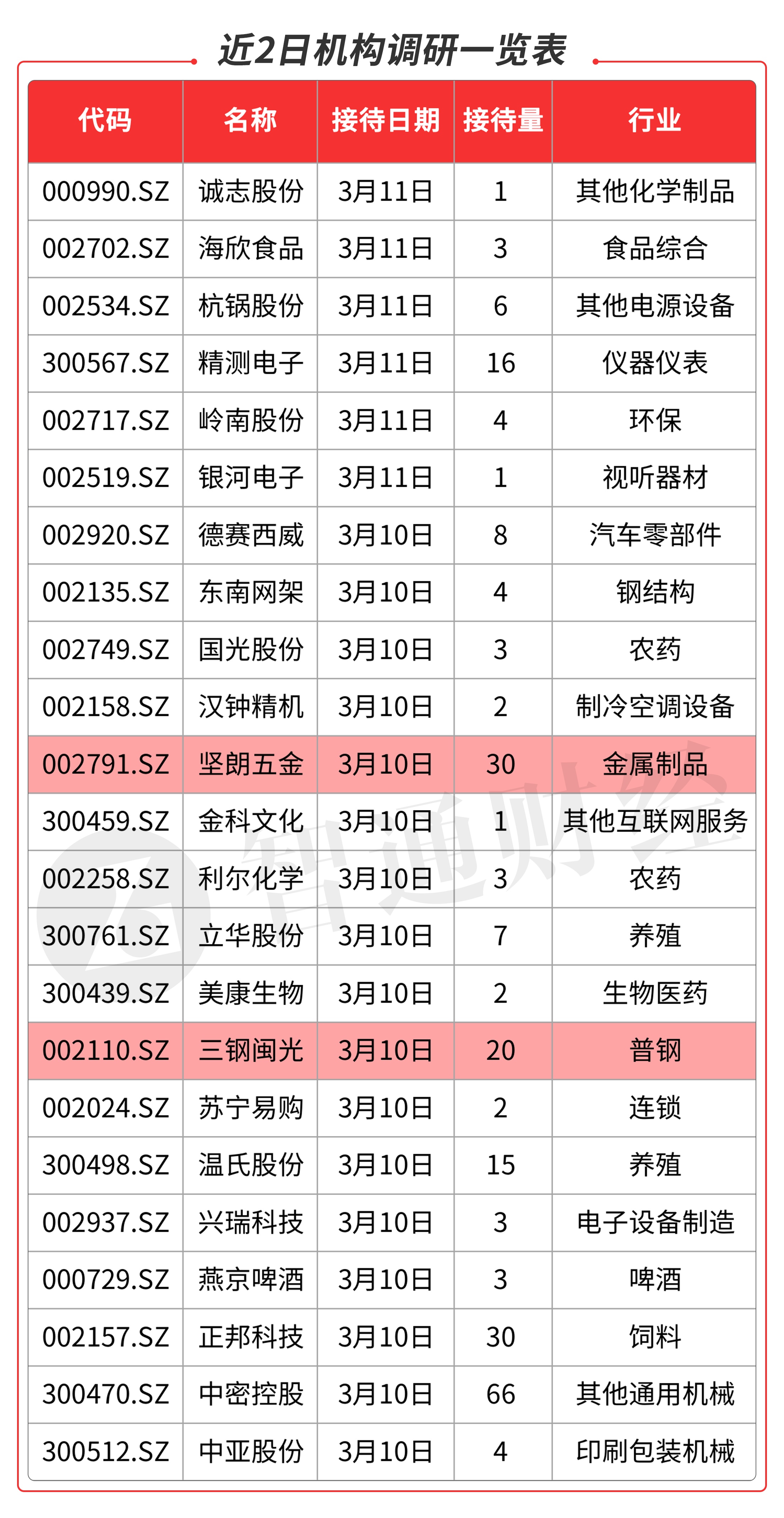 【导读】三钢闽光(002110.SZ)、坚朗五金(002791.SZ)近期获多家机构密集调研。其中三钢闽光是冶金制造业龙头企业,产业主要以钢铁为主业,辅以配套、延伸等附属产业。在收购罗源闽光后,产能扩张有望提升公司长期盈利能力。坚朗五金是最早登陆A股的建筑公司,从事于高端经营建筑五金系统、金属配件等相关产品的研发、生产和销售。凭借产品集成、高效规范的现代化管理体系和资本市场及品牌等竞争优势,全年的经营业绩同比增长28%,且新品收入占比持续提升。