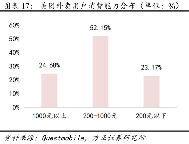 美团用户的消费能力和意愿较强(本来就是服务电商,为“服务”付费),有52%的用户可消费200-1000元,仅有16.5%的用户意愿低消费。