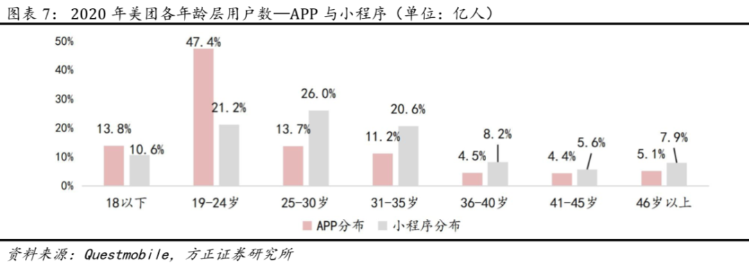 近三年美团的主力用户为男性,2020年男女比例达到54.6%和45.4%,尤其是美团外卖app的男女比例差距进一步扩大至56.9%和43.1%。男性对外卖的接受度更高。