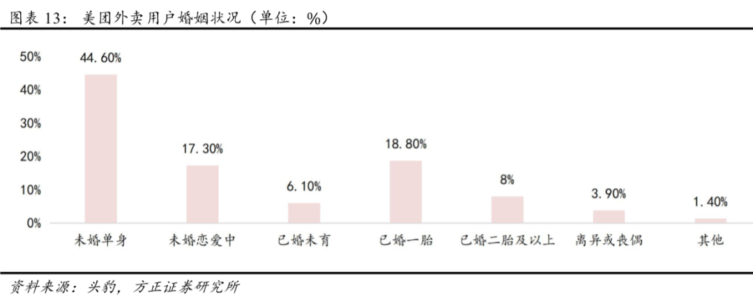 美团外卖用户中,70%为白领人群,20%为家庭消费者,10%为高校学生。家庭用户很多与父母辈一同就餐,或处于“孕育”的特定阶段,为了下一代更偏好做饭。