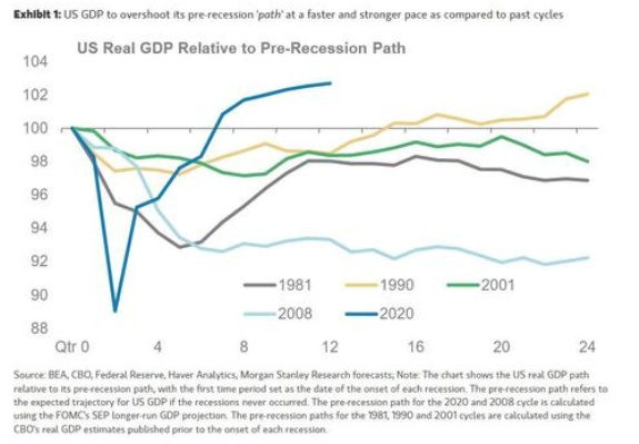 该分析师指出,上一次出现GDP超过衰退前水平还是在20世纪90年代。当时,GDP的恢复时间为15个季度,而这次是7个季度。因此,在这样的速度下,相较20实际90年代的27个季度,预计美国经济仅需12个季度就能达到衰退前水平的103%。