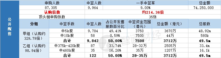 其中,公开配售申购人数87305人,一手中签率9.00%,认购倍数约214.36倍。