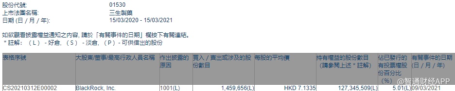 智通财经APP获悉,香港联交所最新资料显示,3月9日,贝莱德增持三生制药(01530)145.97万股,每股作价7.1335港元,总金额约为1041万港元。增持后最新持股数目约为1.27亿股,最新持股比例为5.01%。