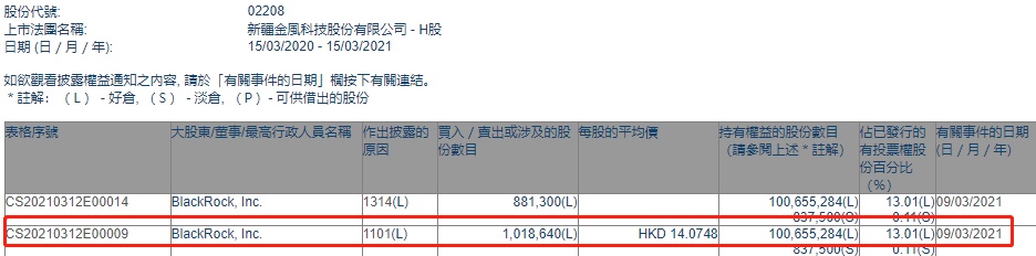智通财经APP获悉,香港联交所最新资料显示,3月9日,贝莱德增持金风科技(02208)101.86万股,每股作价14.0748港元,总金额约为1433.7万港元。增持后最新持股数目约为1亿股,最新持股比例为13.01%。