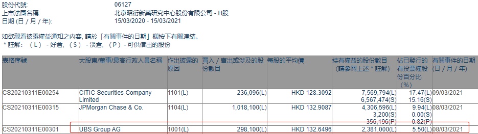 智通财经APP获悉,香港联交所最新资料显示,3月8日,瑞银增持昭衍新药(06127)29.81万股,每股作价132.6496港元,总金额约为3954.3万港元。增持后最新持股数目约为238.1万股,最新持股比例为5.5%。