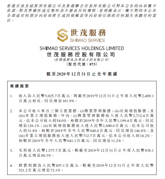 智通财经APP获悉,3月15日,世茂服务(00873)发布上市后首份财报并举办2020年全年业绩发布会。2020年,世茂服务营业收入50.26亿元,同比增长101.9%;归母净利润6.93亿元,同比增长80.2%。公司合约面积达2.01亿平方米,同比增长99.4%,在管面积突破1.46亿平方米,同比增长114.4%,各项业绩指标表现抢眼。