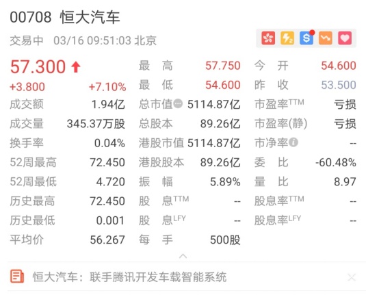 智通财经APP获悉,3月16日,恒大汽车(00708)大幅高开,之后持续飙升,截至发稿大涨7.94%,报57.75港元。