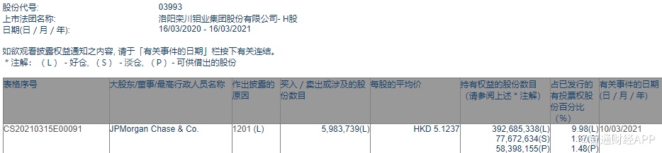 智通财经APP获悉,香港联交所最新资料显示,3月10日,摩根大通减持洛阳钼业(03993)598.37万股,每股作价5.1237港元,总金额约为3066万港元。减持后最新持股数目约为3.93亿股,最新持股比例为9.98%。