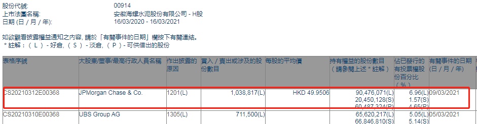 智通财经APP获悉,香港联交所最新资料显示,3月9日,摩根大通减持海螺水泥(00914)约103.88万股,每股作价49.9506港元,总金额约为5188.87万港元。减持后最新持股数目约为9047.61万股,最新持股比例为6.96%。