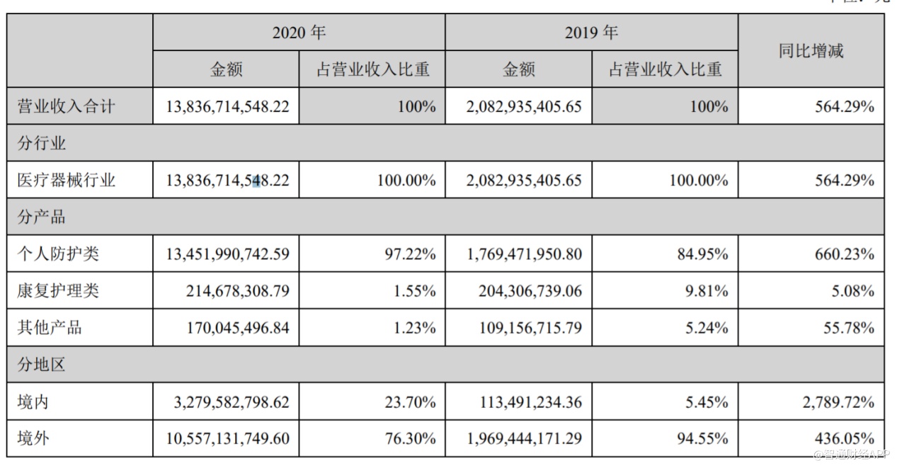 据财报显示,由于全球新冠疫情的爆发对一次性防护手套需求的激增,英科医疗在2020年录得收入138.37亿元,同比增长564.29%;股东净利润为70.07亿元,同比增长3829.56%。