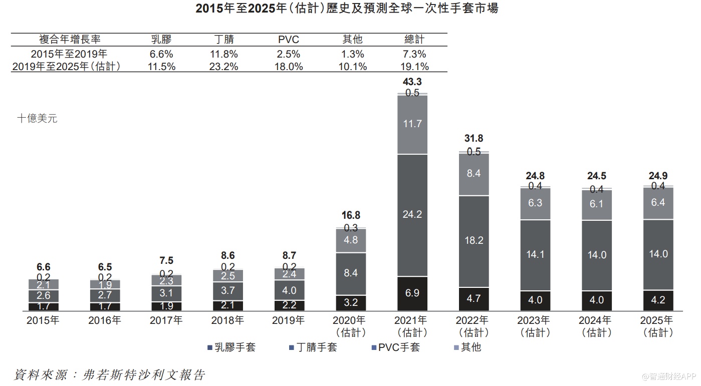 弗若斯特沙利文的报告亦证明了上述观点逻辑的正确性。据其预测的数据显示,2021年全球一次性手套市场的规模为433亿美元,较2020年的168亿美元将有157.74%的同比增长。这便表示,2021年仍是一次性手套市场维持高景气度的一年。