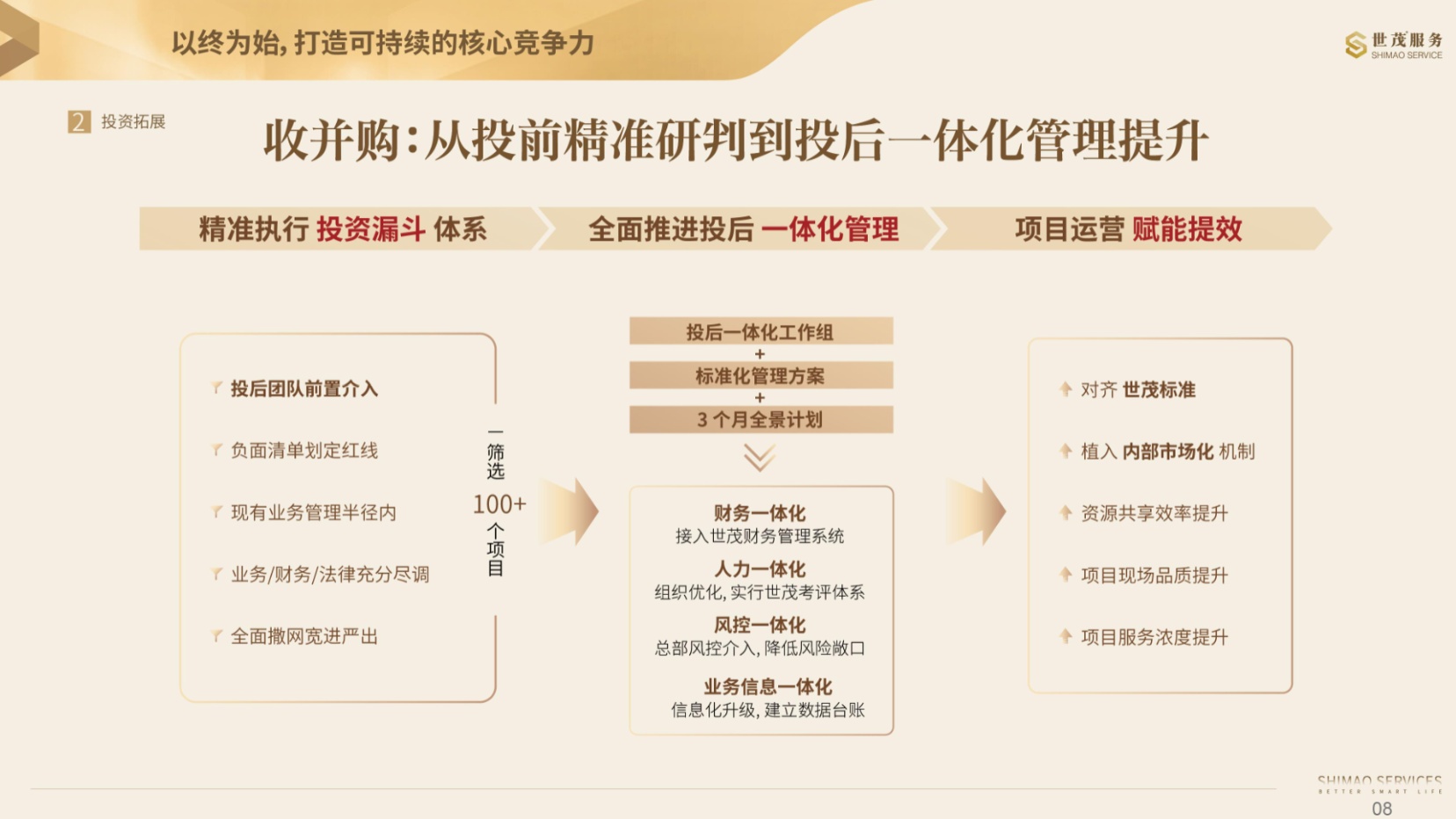 据世茂服务管理层在业绩会上表示,公司在与中小物业公司合作的过程中有非常明确的“价值投资”理念,对所有项目进行投后一体化管理,希望达到“1+1>2”效果。其中,公司在行业中实行了独有的“投后前置”建立了从投前研判到投后一体化整合管理赋能提升的完整体系。