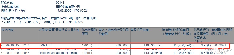 智通财经APP获悉,香港联交所最新资料显示,3月10日,FMR LLC减持建滔集团(00148)27万股,每股作价35.1891港元,总金额约为950.11万港元。减持后最新持股数目约为1.10亿股,最新持股比例为9.98%。