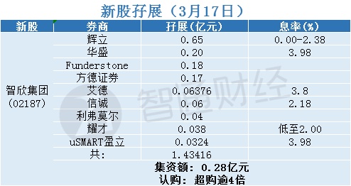 智通财经APP获悉,智欣集团(02187)正在招股中。截至3月17日,辉立、耀才等合计为其借出1.43416亿港元,超购逾4倍。