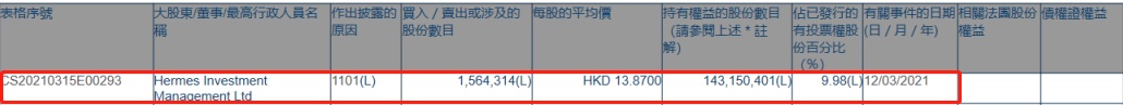 智通财经APP获悉,香港联交所最新资料显示,3月12日,Hermes Investment Management Ltd增持新秀丽(01910)156.43万股,每股作价13.87港元,总金额约为2169.68万港元。增持后最新持股数目约为1.43亿股,最新持股比例为9.98%。