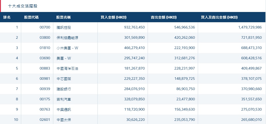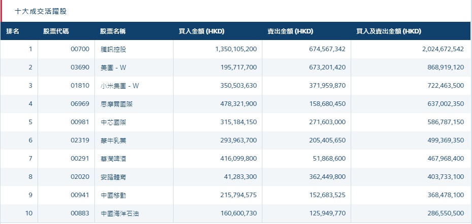 此外,思摩尔国际(06969)、建设银行(00939)、蒙牛乳业(02319)分别获净买入3.19亿、1.97亿、8855万港元。而中国太保(02601)、中海油(00883)分别遭净卖出2.04亿、1231万港元。
