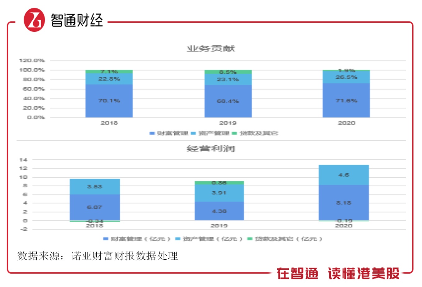 而受益于财富管理及资产管理业务强劲表现,诺亚Q4收入同比增长20.9%,全年收入实现逆势增长,实现全年经营利润为12.58亿元,同比增长37.5%,经营利润率38.1%,同比提升11.1个百分点,各项业务盈利水平均得到提升,其中财富管理经营利润率34.5%,提升15.67个百分点,资产管理经营利润率52.5%,同比提升2.6个百分点。